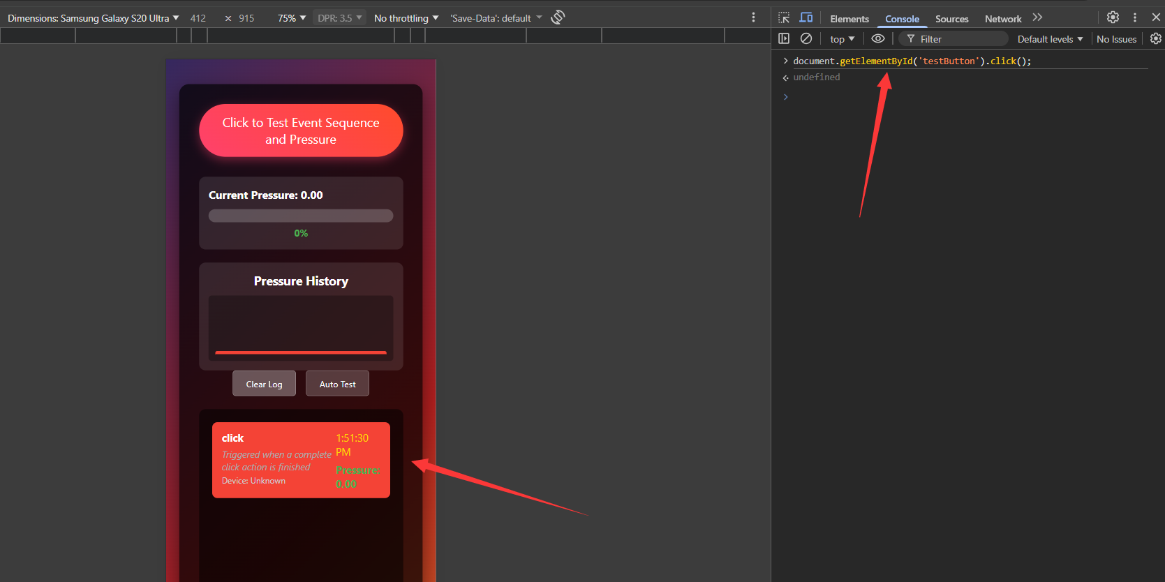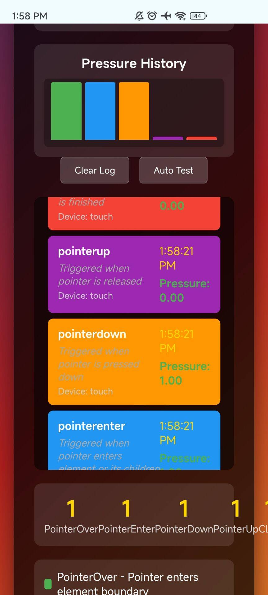 When using “Android Chrome Fingerprint”, the pointerdown event naturally includes pressure values from 0.1–0.45.